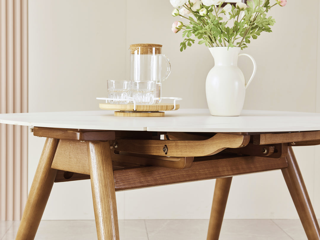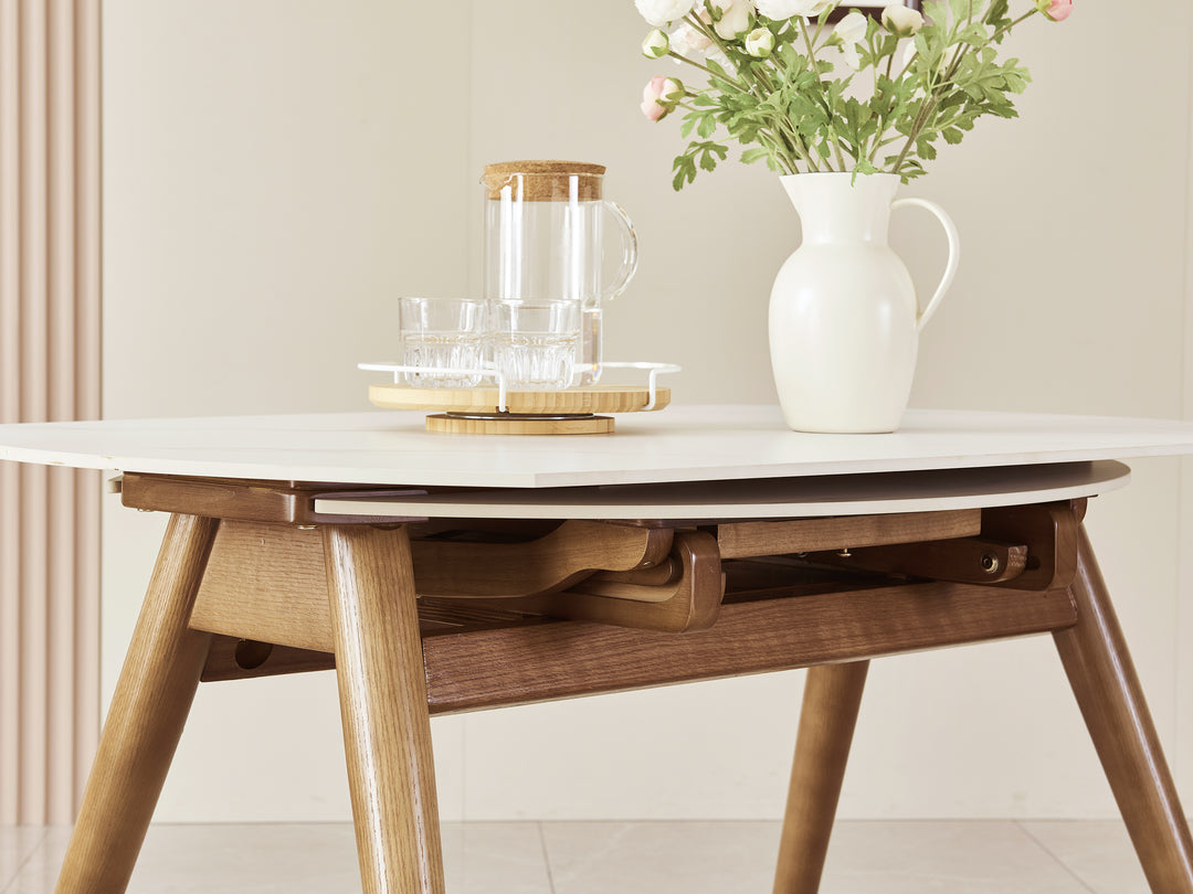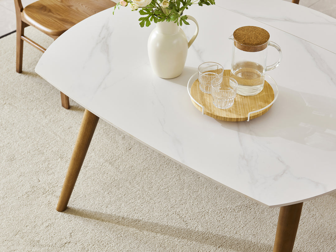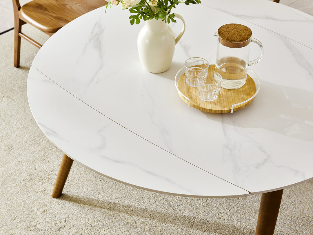 - Its white marble-look surface adds elegance, while the sturdy oak legs and extendable function ensure long-lasting durability.